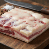 Richly marbled cut of buffalo meat with a generous layer of firm, white fat, perfect for rendering, slow-cooking, or adding depth to stews and sausages. A robust flavor profile for any culinary creation.